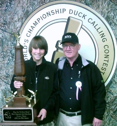 | Greg Hubbell Jr with Granpa "Butch" Richenback the Legend, founder RNT Duck Calls at the 2008 Junior World Duck Calling Championship in Stuttgart Arkansas. Butch became Greg Jr's mentor after "The Professor" Stuart McCullough from Los Banos, CA trained Greg with the basics of a Main Street Competition Calling Routine. |